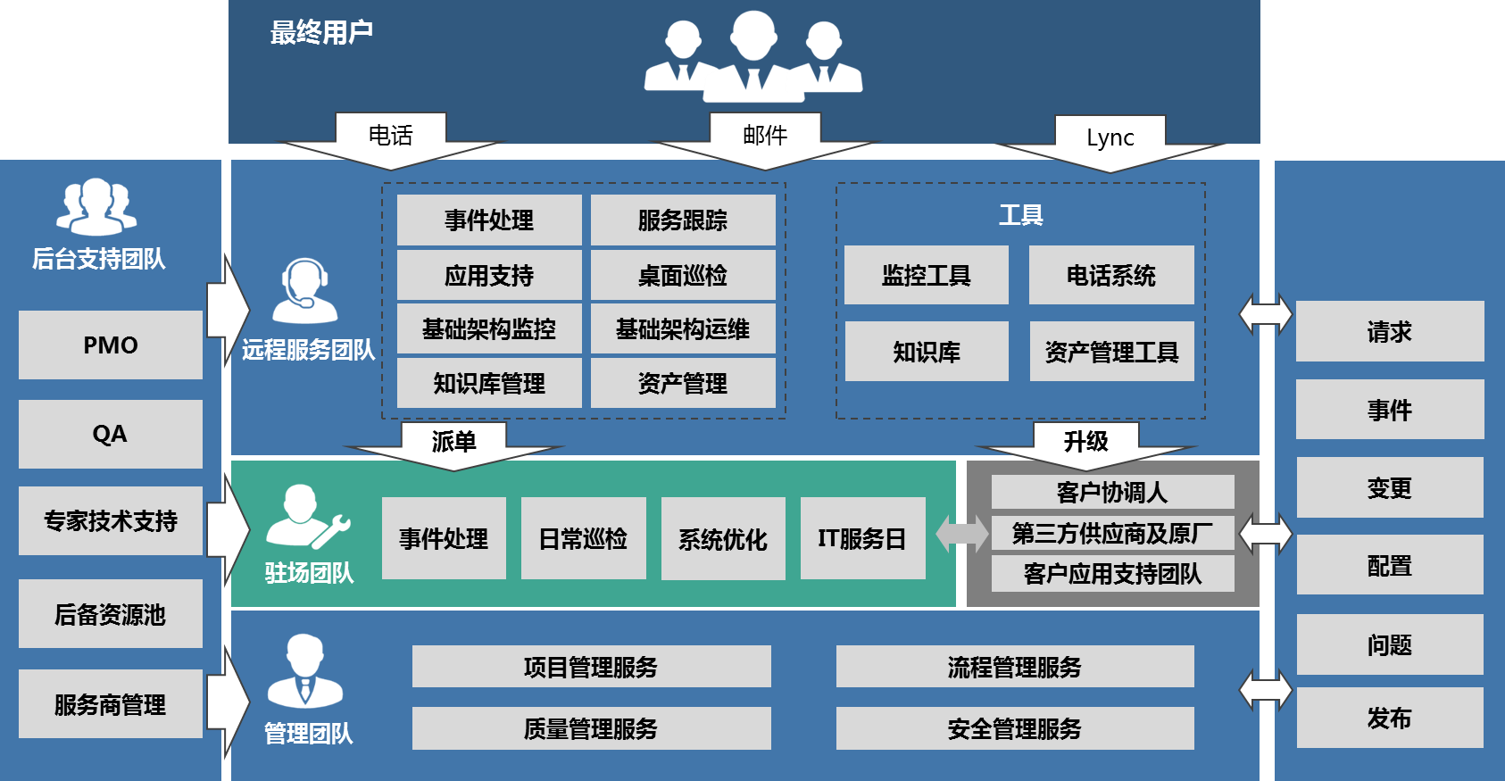2) 为内部最终用户提供IT服务支持服务。支持服务包括桌面硬件和软件,电话,打印机,外设等;